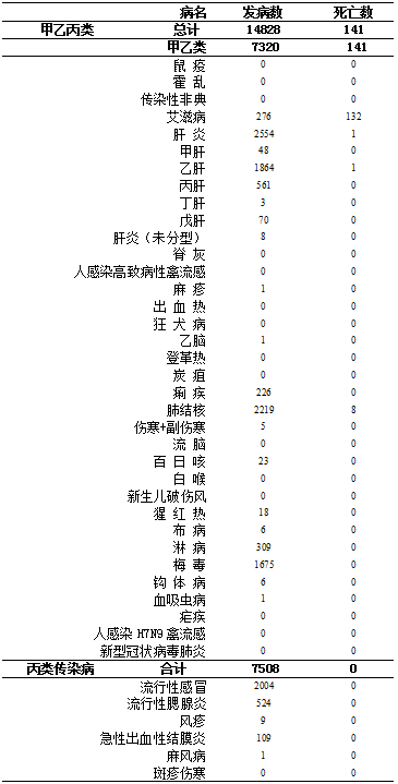 乙类传染病共报告发病7320例,较上月同期(7561例) 下降3.19%,较去年同期(7150例)上升2.38%;死亡141例,较上月同期(125例)上升12.8%,较去年同期(140例)上升0.71%;报告发病数居前3位的病种依次为肺结核、乙肝、梅毒。