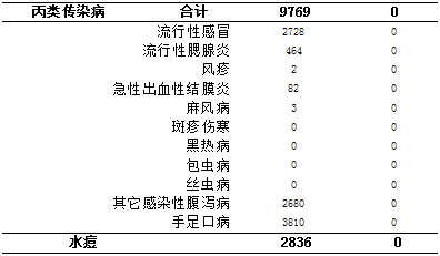 丙类传染病共报告发病9769例,较上月同期(7508例)上升30.11%,较去年同期(9760例)上升0.09%;无死亡。报告发病数居前3位的病种依次为手足口病、流行性感冒、其它感染性腹泻。